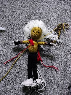 I used the same technique for the feet as I did with the Janos doll, but used a sort of off-white acrylic yarn to give it a sort of ivory colour. This was also to try to make a clear distinction between the claws and the hair.