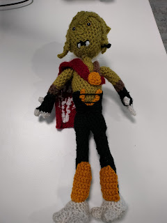 As mentioned, the flesh was in a dark green acrylic yarn, changing to a brown alpaca wool for the sort of leather wraps, then finally to black for his gloves.